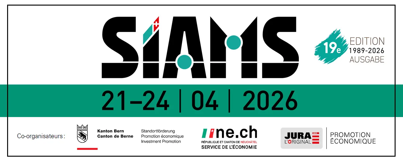 SIAMS, die Fachmesse für die Produktionskette der Mikrotechnik, findet vom 21. bis 24. April 2026 in Moutier im Forum de l’Arc statt.